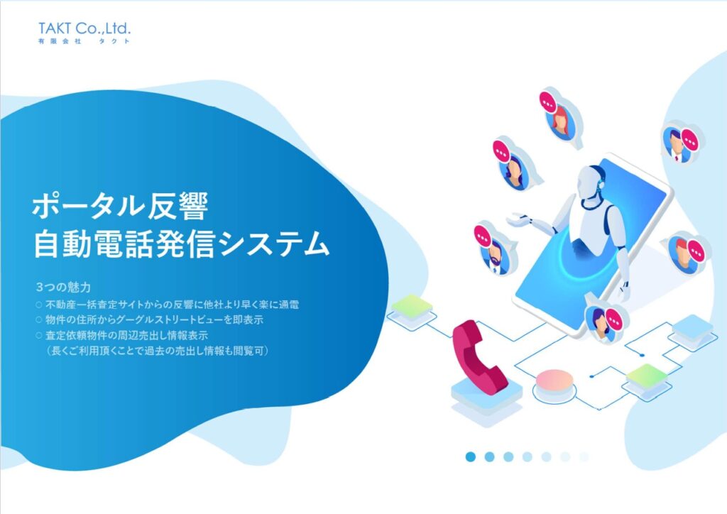 お知らせ ポータルサイト自動電話発信システム 不動産一括査定の査定依頼から効率よく訪問査定を獲得するためには、他社よりも早く、誰よりも先に売主様と話すことが最も重要です。当社のシステムは、査定依頼メールが到達した瞬間に、売主様と不動産会社様へ自動で電話を発信します。これにより、査定依... 2026.03.19 お知らせ